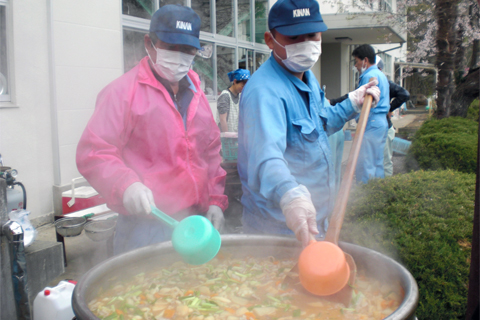 The project was headed by Toshihiro Nikai, a member of the House of Representatives, and included five volunteers from the company who were assigned to meal distribution.The project ran from April 24th 2011 for a period of five days. Personnel distributed meals at five sites in Iwate Prefecture (Kamiyoinahokan, Iwate Prefectural Otsuchi High School, Iwate Prefectural Yamada High School, Otsuchi Town Akahama Elementary School, Otsuchi Town Ando Elementary School), one site in Miyagi Prefecture (Ishimaki City Oginohama Junior High School), and three sites in Fukushima Prefecture (Minaminomori Sports Park, Minamisoma City Ishigami Daiichi Elementary School, Minamisoma City Kashima Health Center).